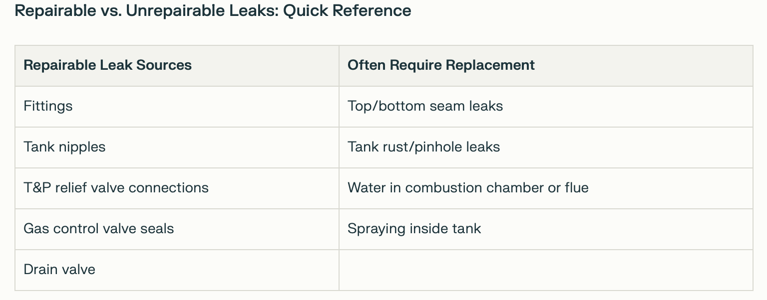Repairable Leak SourcesOften Require ReplacementFittingsTop/bottom seam leaksTank nipplesTank rust/pinhole leaksT&P relief valve connectionsWater in combustion chamber or flueGas control valve sealsSpraying inside tankDrain valve